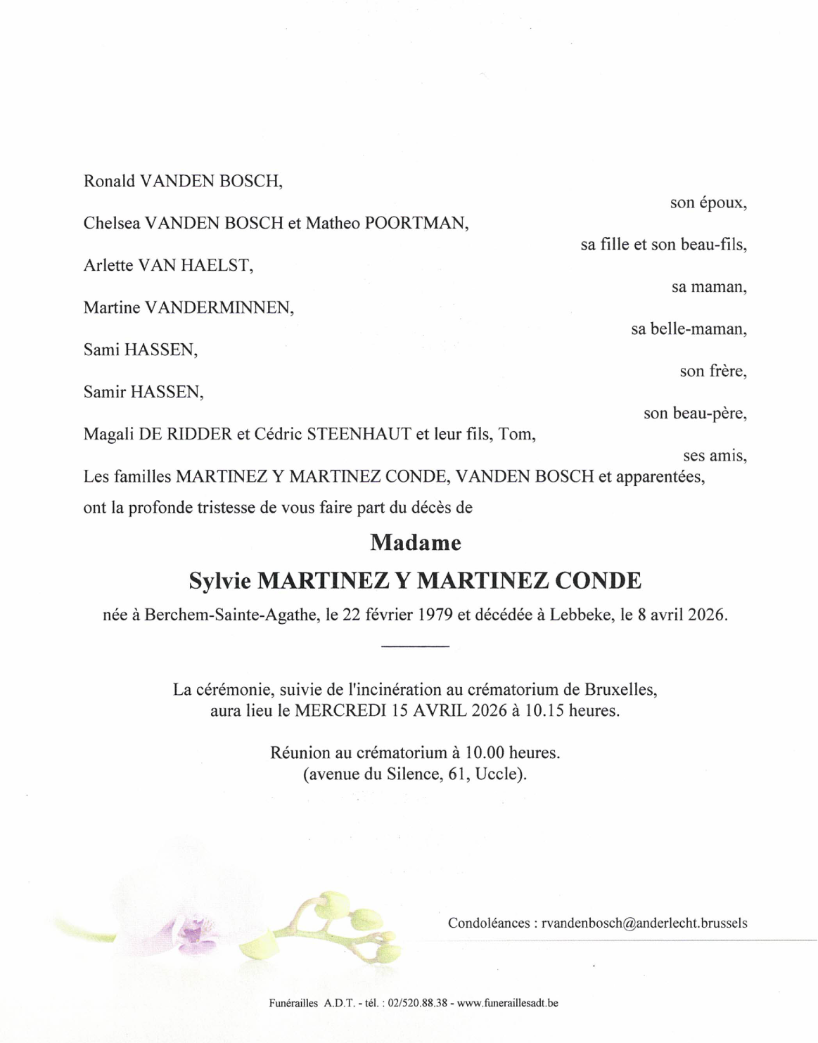 crématorium intercommunal de Bruxelles de Uccle le mercredi 15 avril à 10 heures 15