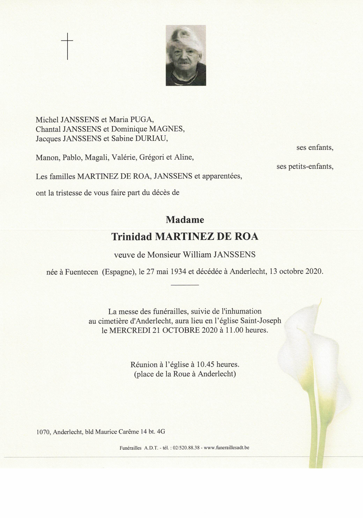 Décédée à Anderlecht (1070) le mardi 13 octobre 2020 à l'âge de 86 ans