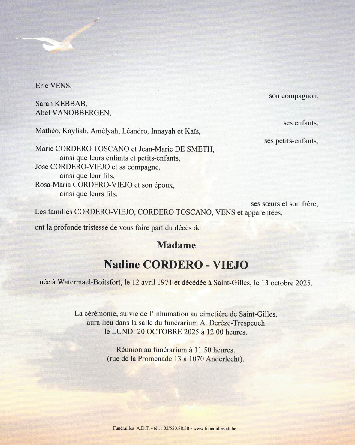 Décédée à Saint-Gilles (1060) le lundi 13 octobre 2025 à l'âge de 54 ans