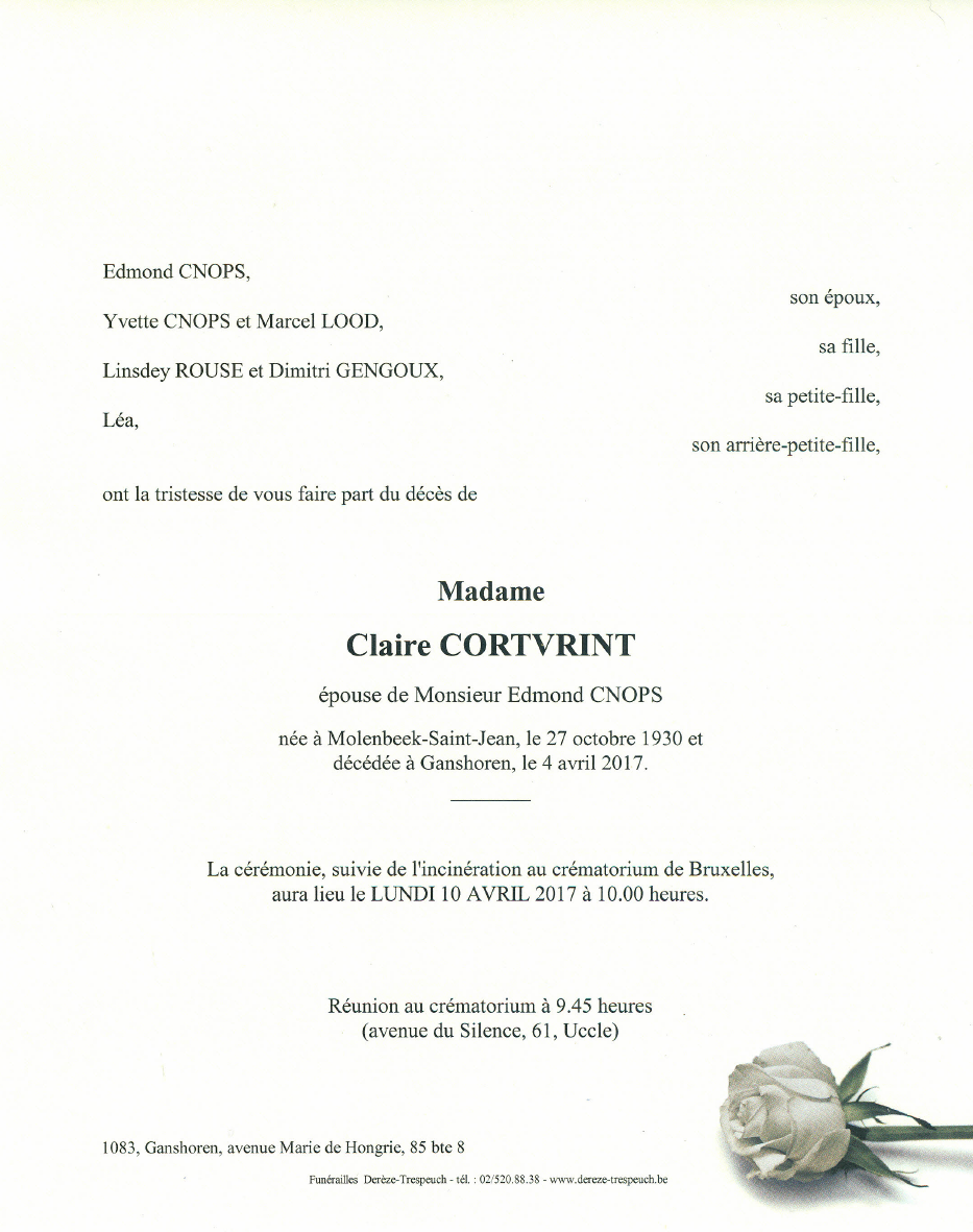 Décédée à Ganshoren (1083) le mardi 4 avril 2017 à l'âge de 86 ans