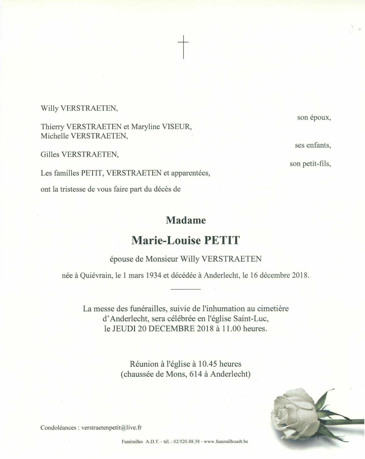 Décédée à Anderlecht (1070) le dimanche 16 décembre 2018 à l'âge de 84 ans
